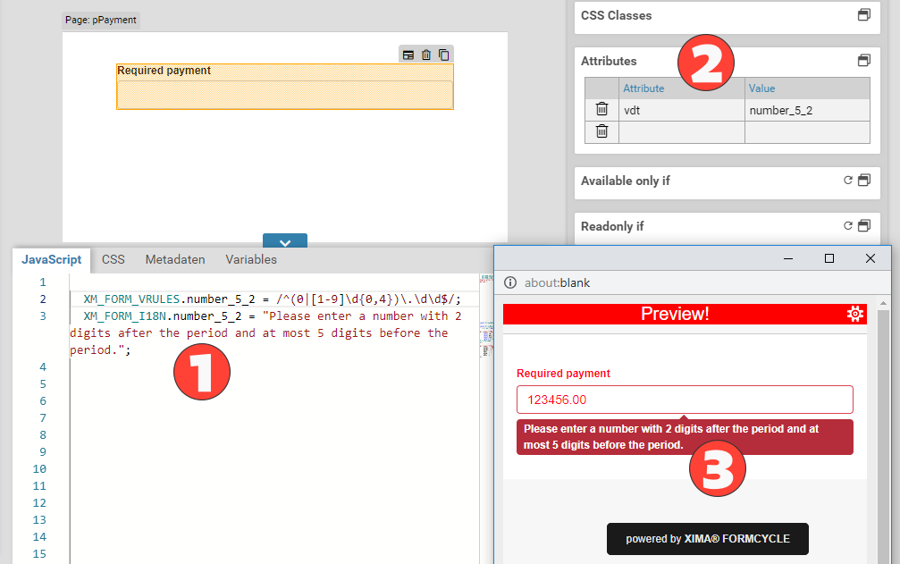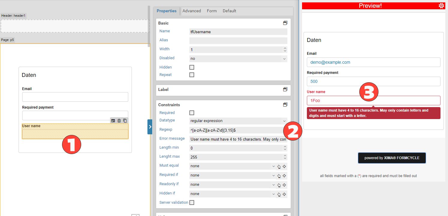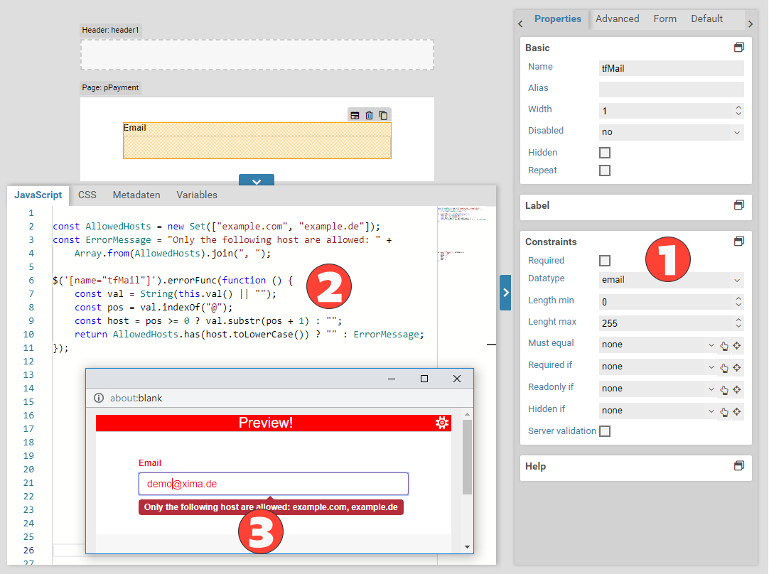 Please note that the server-side validation is supported only for constraints that were set in the graphical user interface of the Xima® Formcycle Designer. If you added any custom logic or validators via JavaScript, that logic is not considered during the server-side validation process. Also, if you override built-in validators (see below), you should disable the server-side validation as the server always uses the default rules for built-in validators.