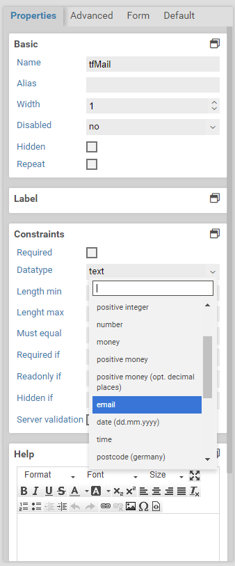For many commonly used datatypes there are built-in validators provided by Xima® Formcycle. You can select the datatype in the constraints sections of the properties panel.