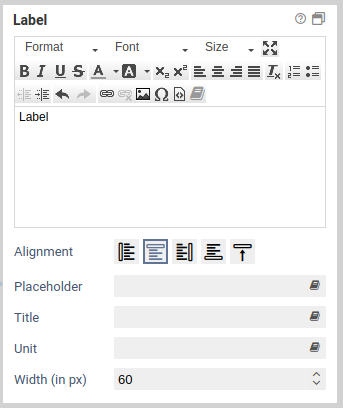Width | The width of the form element, relative to other elements in the same row. For example, when you place three elements next to each other in the same row and set their widths to 10, 10 und 30, they will take up 20% (=10/(10+10+30)), 20%, and 60% of the entire width of the row, respectively. |
