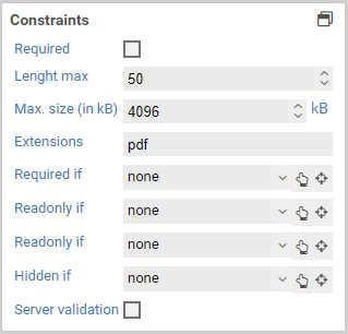 The constraints panel contains options to check the value of form fields, when form fields should be visible and when they can be edited. Some constraints are available only for some element, see the list of element..