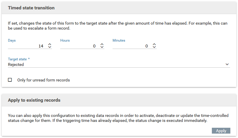 - Choose the maximum time frame a form record may remain in this state before it is moved to another state.